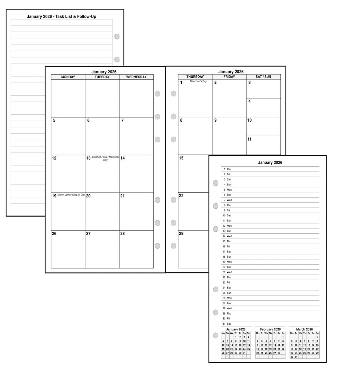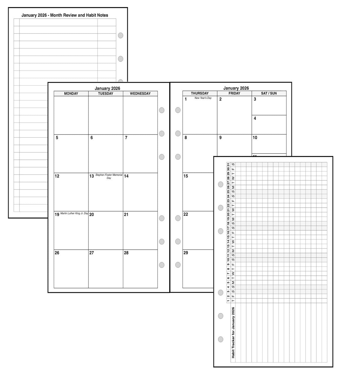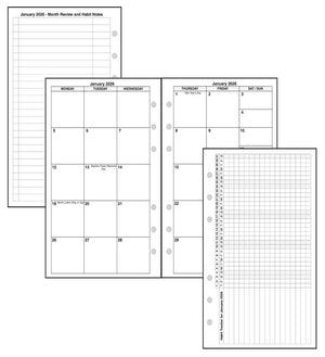 Monthly spreads can be printed back-to-back with nothing separating them, or optionally separated by notes, planning pages, or a monthly habit tracker.