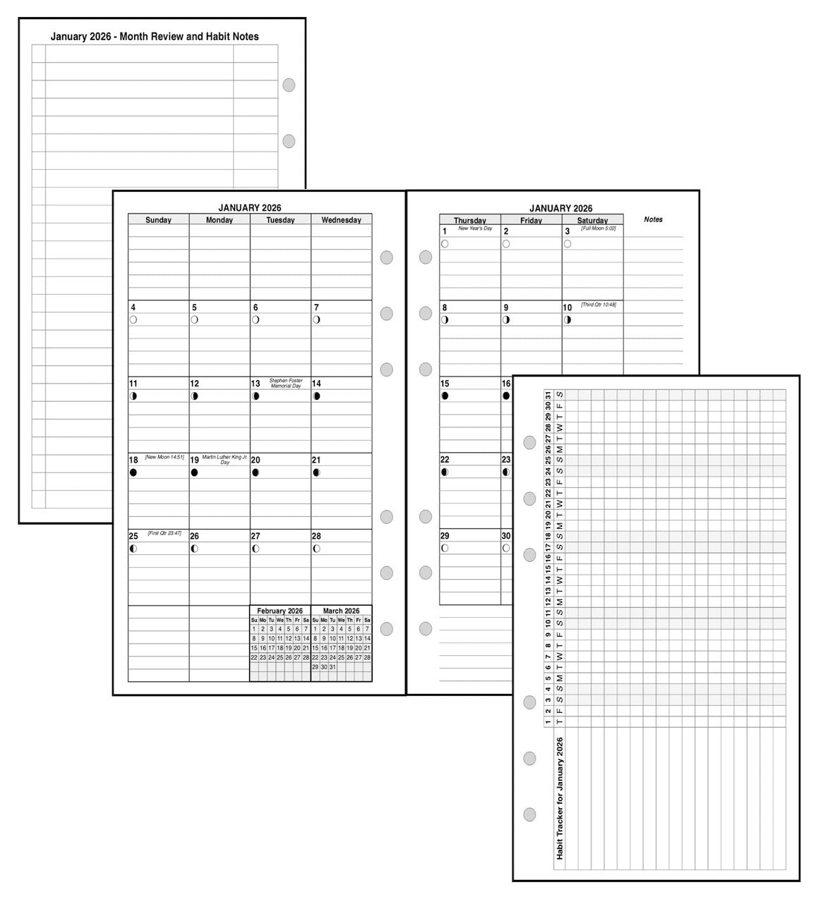 Monthly spreads can be printed back-to-back with nothing separating them, or optionally separated by notes, planning pages, or a monthly habit tracker.