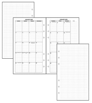 This is a monthly planner insert for Personal size notebooks. Page size is Personal, 3¾" x 6¾" (95mm x 171mm). The week start is optionally Sunday or Monday. Each month is a 2-page spread. The first 4 days of the week are on the left-hand page, and the last 3 days are on the right, plus an area for notes. Lines are printed in the daily blocks. This is a 5 week monthly layout, so occasionally the 30th and/or the 31st would fall below the bottom row. When this happens, these dates can be either moved to the first 2 daily blocks in the first row, or these overflow days can share the first 2 blocks of the 5th week.