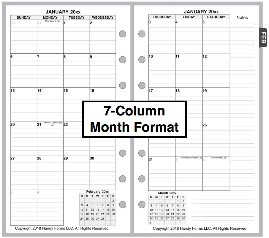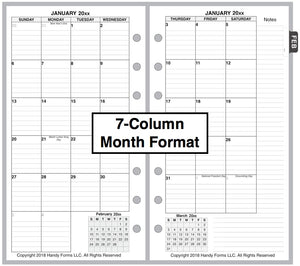 This is a daily and monthly planner insert for the popular Personal size notebooks. Page size is Filofax Personal standard 3¾" x 6¾" (95mm x 171mm). Choose the week starting day as Sunday or Monday. Each day is on one page, and months are 2-page spreads. Each daily page has appointment slots from 7:00 am to 8:00 pm. In addition there is a column for daily activities and a checklist for things to do. The daily activity section is divided into 3 subsections labeled Personal, Family / Home, and Work. The subsection names can be changed through customization. Included are mini calendars for the current and next months.
