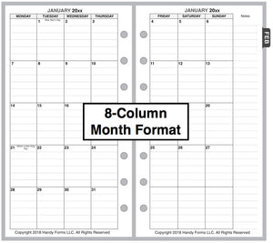 This is a daily and monthly planner insert for A5 size notebooks. Choose the week starting day as Sunday or Monday. Each day is on two pages. There is a checkmarked section for Daily Tasks, appointment times from 7:00 am to 7:00 pm, a Daily Monitor section for tracking important things like expenses and messages, and a block for notes.