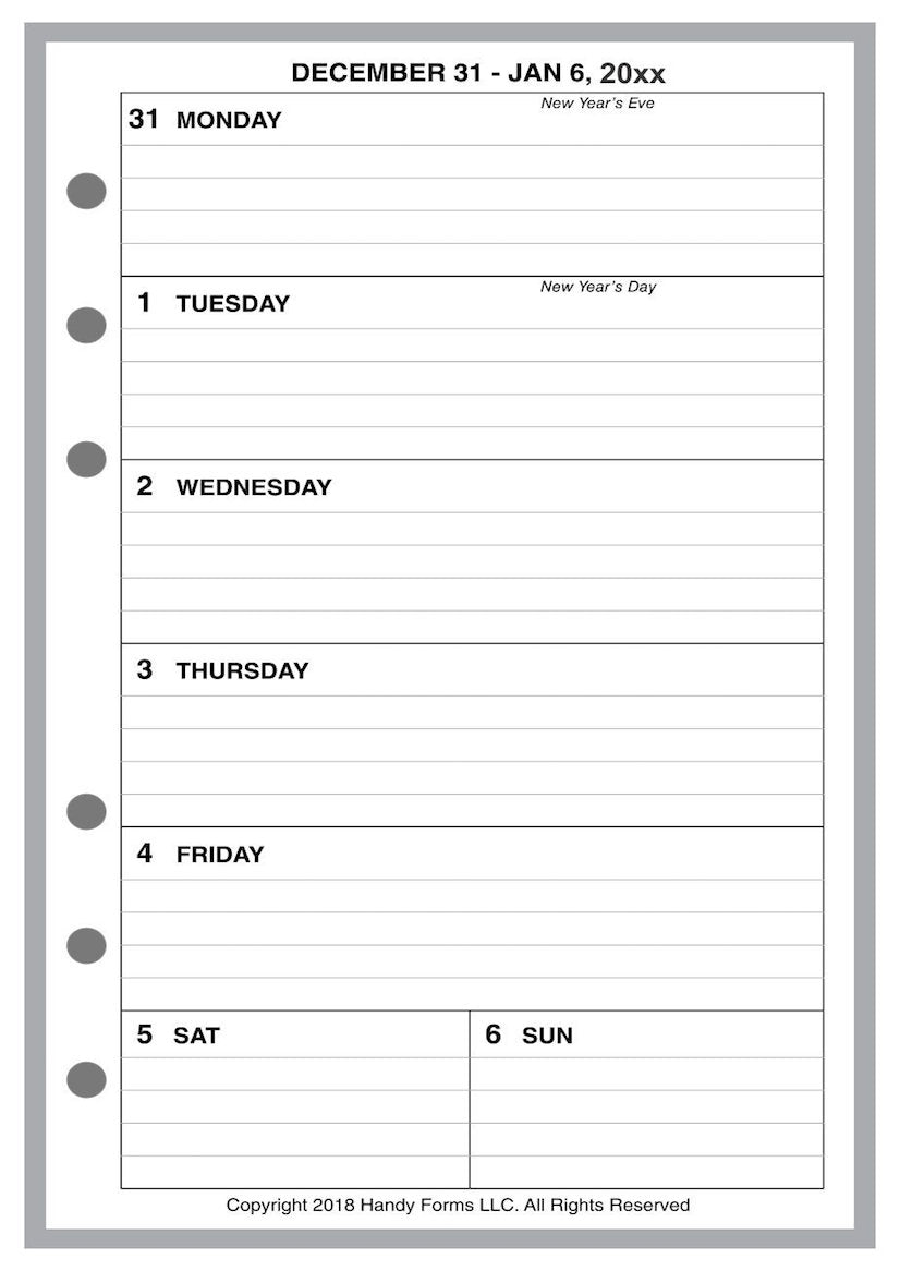 This is a weekly and monthly planner insert for A6 notebooks. Page size is A6 standard, 4.13in x 5.83in (105mm x 148mm). The week starts on Monday. Each week is on one page. The weekly page includes full sized blocks for Monday through Friday, with half size blocks for Saturday and Sunday at the bottom. Also included are 1-page yearly calendars for the current year and next year.
