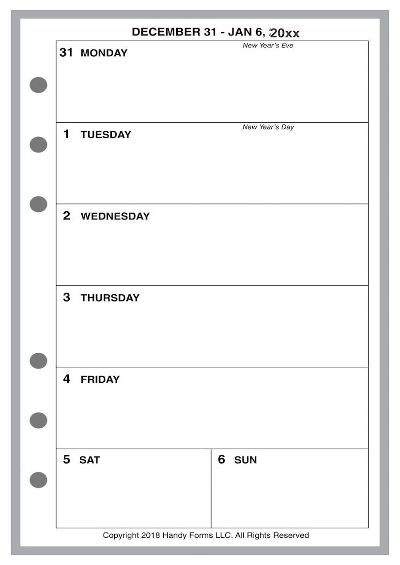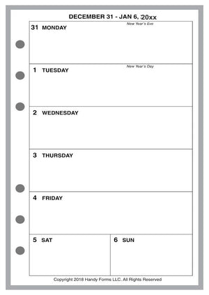 If selected, the monthly spreads are merged with the weekly pages so that the month appears immediately before the weekly pages where the first day of that month occurs. A durable plastic tab is attached to the weekly page just before the month. The monthly pages are available in 3 different formats called 6-column, 7-column, and 8-column. Please see the images for examples.
