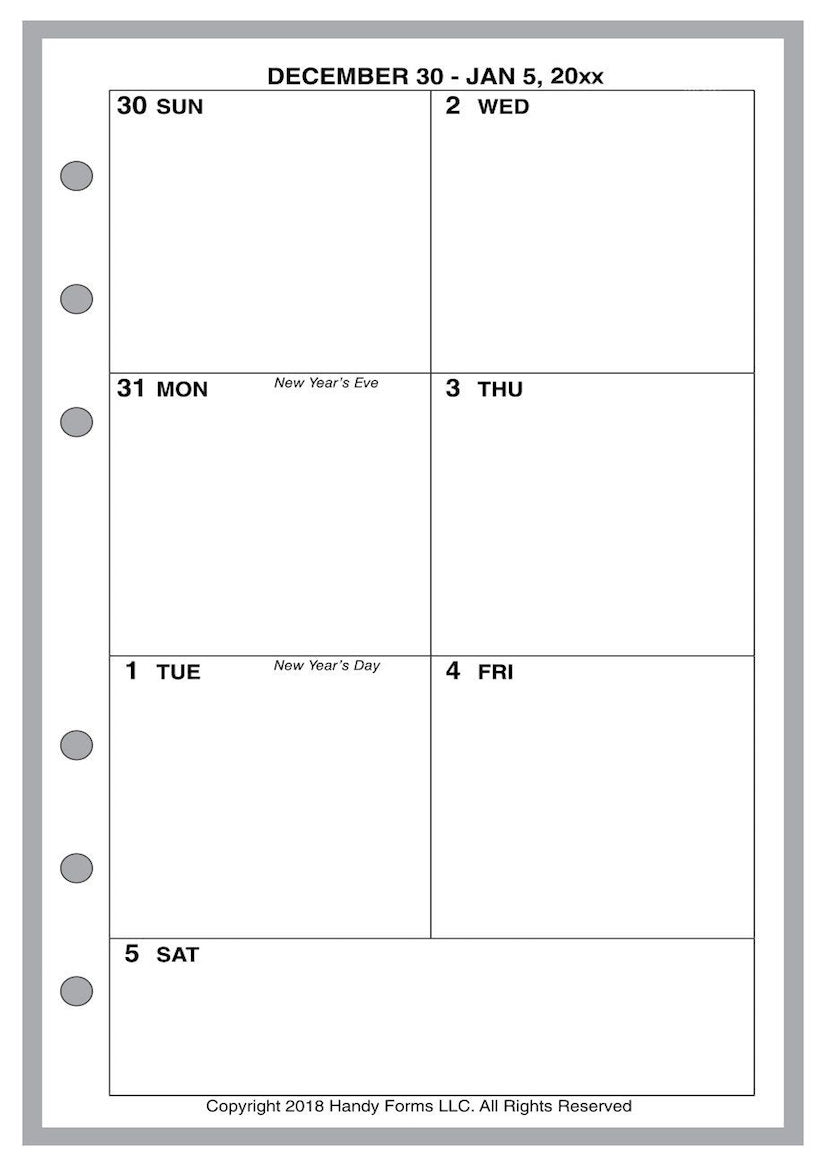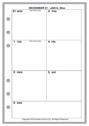 This is a weekly and monthly planner insert for A6 notebooks. Page size is A6 standard, 4.13in x 5.83in (105mm x 148mm). Choose the week start day as Sunday or Monday. Each week is on one page. The daily blocks are arranged vertically with the first 3 days of the week on the left, the next 3 on the right, with the last day across the bottom.