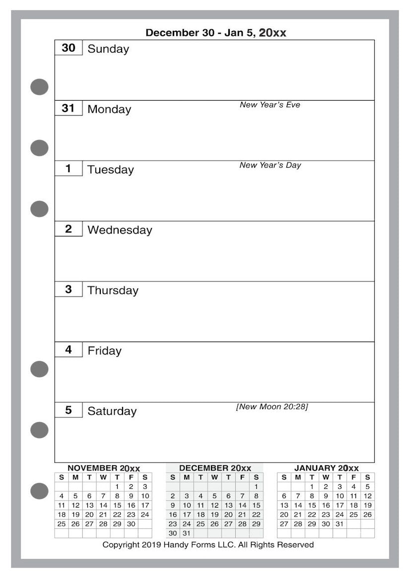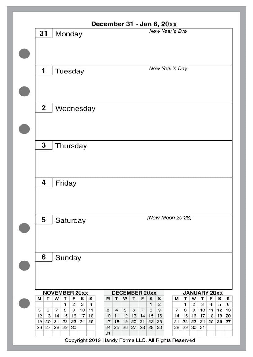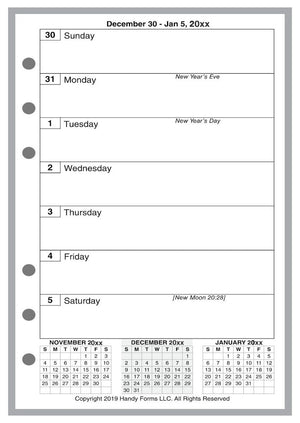 This is a weekly and monthly planner insert for A6 notebooks. Page size is A6 standard, 4.13in x 5.83in (105mm x 148mm). Choose the week start day as Sunday or Monday. Each week is on one page, with separate blocks for each day. There are 3 mini-reference calendars across the bottom of each page for the previous, current, and following month.
