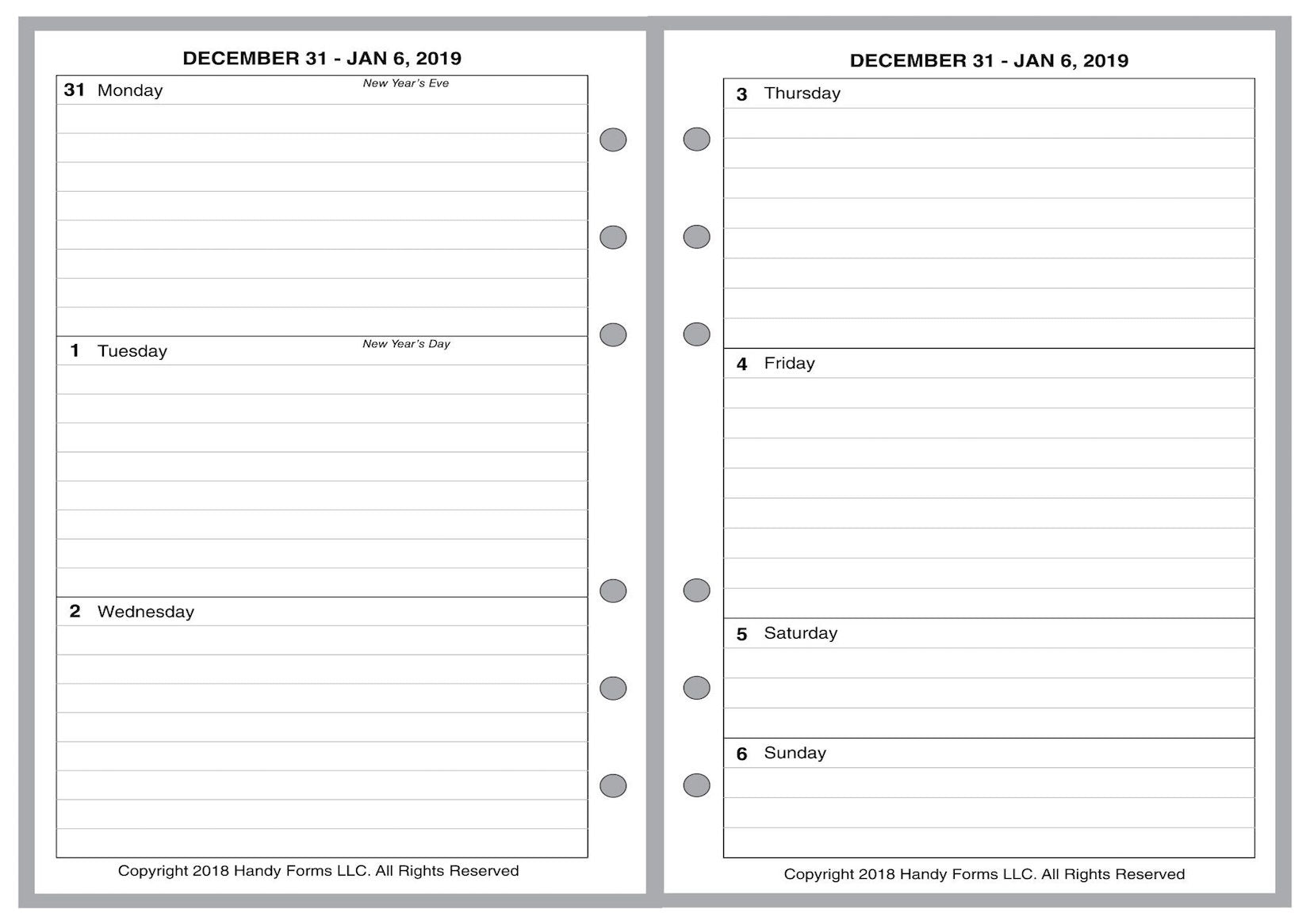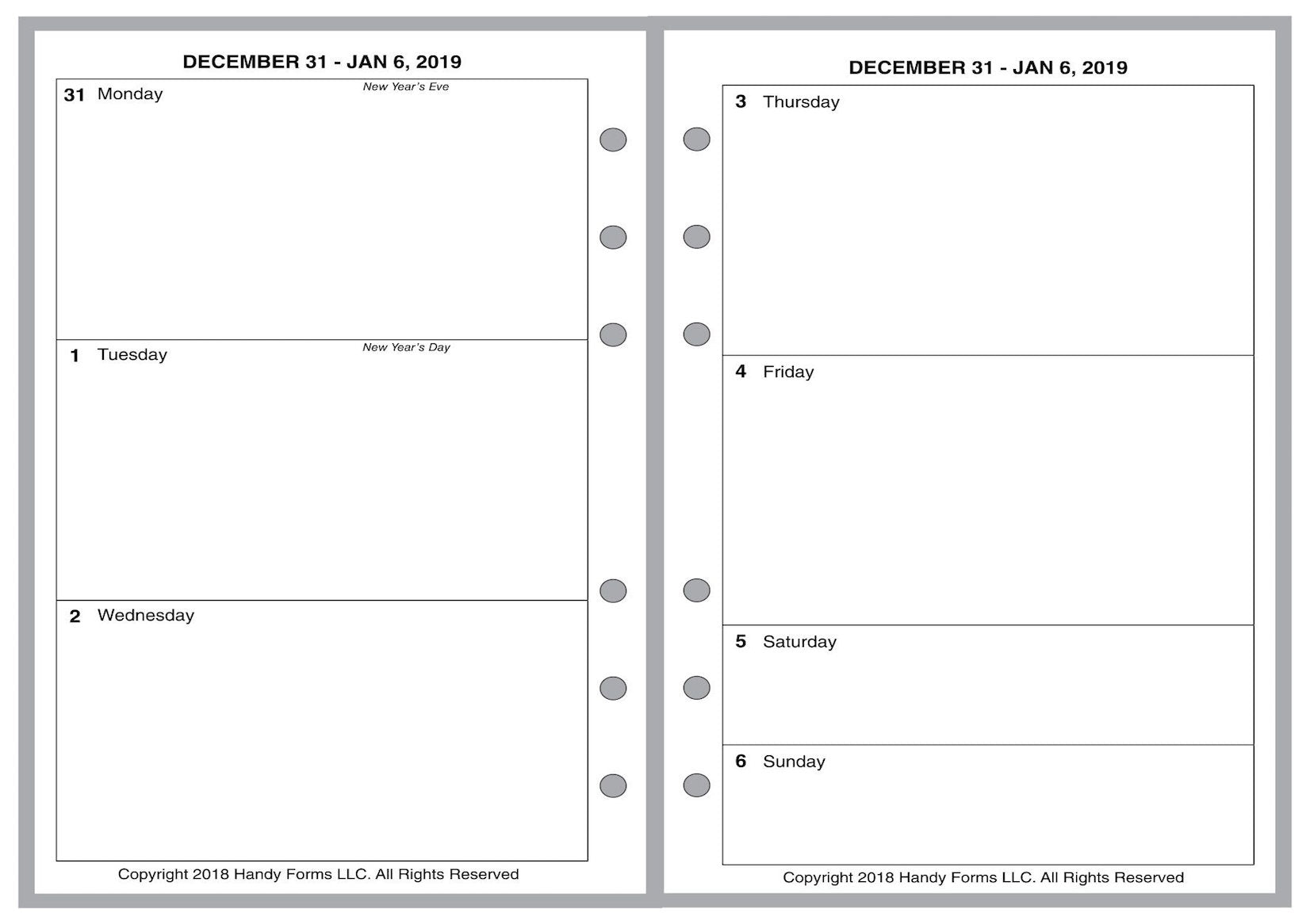 If selected, the monthly spreads are merged with the weekly pages so that the month appears immediately before the weekly pages where the first day of that month occurs. A durable plastic tab is attached to the weekly page just before the month. The monthly pages are available in 3 different formats called 6-column, 7-column, and 8-column. Please see the images for examples.