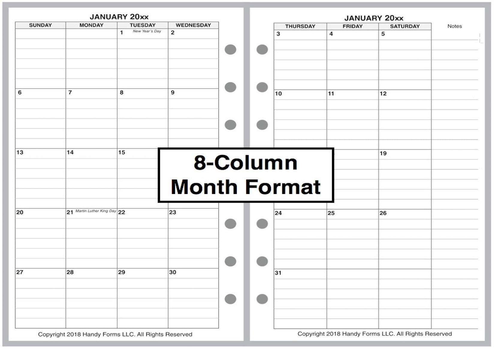 If selected, the monthly spreads are merged with the weekly pages so that the month appears immediately before the weekly pages where the first day of that month occurs. A durable plastic tab is attached to the weekly page just before the month. The monthly pages are available in 3 different formats called 6-column, 7-column, and 8-column. Please see the images for examples.
