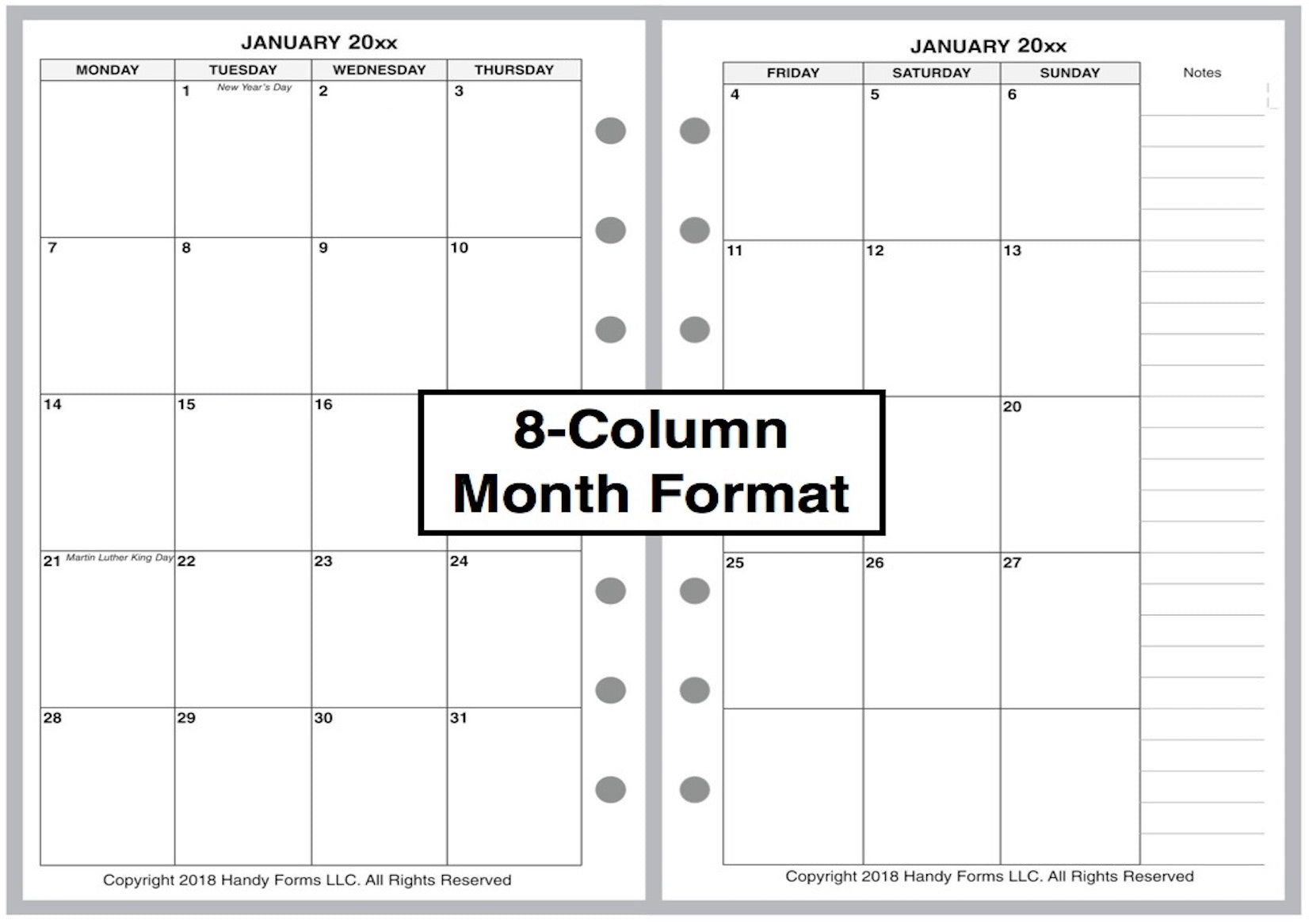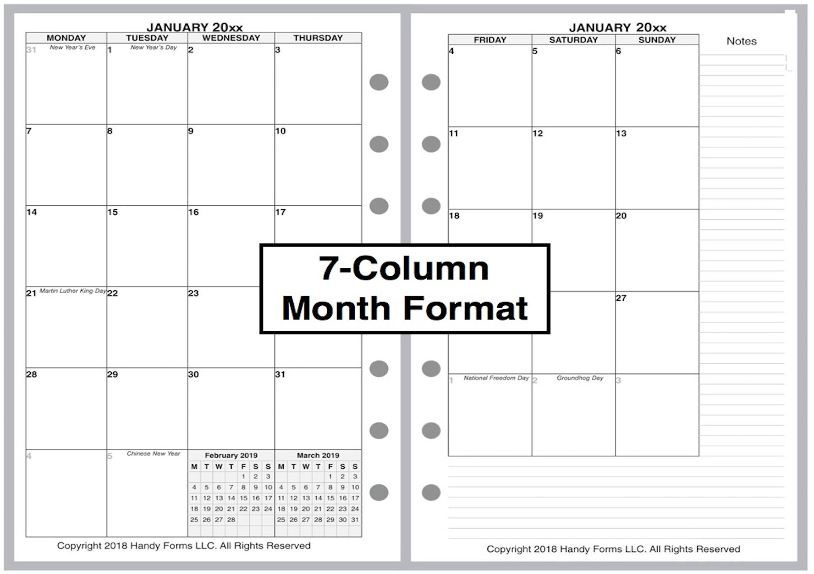 If selected, the monthly spreads are merged with the weekly pages so that the month appears immediately before the weekly pages where the first day of that month occurs. A durable plastic tab is attached to the weekly page just before the month. The monthly pages are available in 3 different formats called 6-column, 7-column, and 8-column. Please see the images for examples.