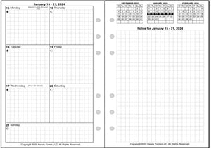 This is a weekly & monthly planner insert for A6 size notebooks. Page size is A6 standard, 4.13in x 5.83in (105mm x 148mm). Choose the week start day as Sunday or Monday. Each week is a 2-page spread. The days of the week are on the left. The first 6 days of the week are arranged in 2 columns, 3 days on the left and 3 on the right. The 7th day spans across the bottom. On the right is a note page which includes mini-reference monthly calendars showing the previous, current, and following months.