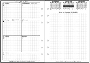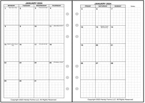 If selected, the monthly spreads are merged with the weekly pages so that the month appears immediately before the weekly pages where the first day of that month occurs. A durable plastic tab is attached to the weekly page just before the month. The monthly pages are available in 3 different formats called 6-column, 7-column, and 8-column. Please see the images for examples.