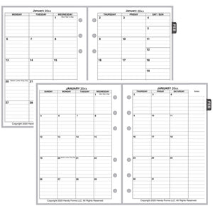 7-Column style: Available with Sunday or Monday start. The first 4 days of the week are on the left-hand page, and the last 3 days are on the right. A lined area for notes is printed in the right-hand column and below the last row on the right. Mini reference calendars are included for the 2 following months.