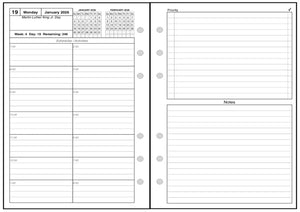 This is a daily and monthly planner insert for the popular A6 size notebooks. Page size is A6 standard, 4.13in x 5.83in (105mm x 148mm). Choose the week starting day as Sunday or Monday. Each day is on two pages. The hourly appointment blocks are arranged vertically in 2 columns with times from 6:00 am through 7:00 pm. The appointment time range can be changed through customization. Each appointment slot has 4 lines for detailed information. There is also a priority to do list and an area for notes.