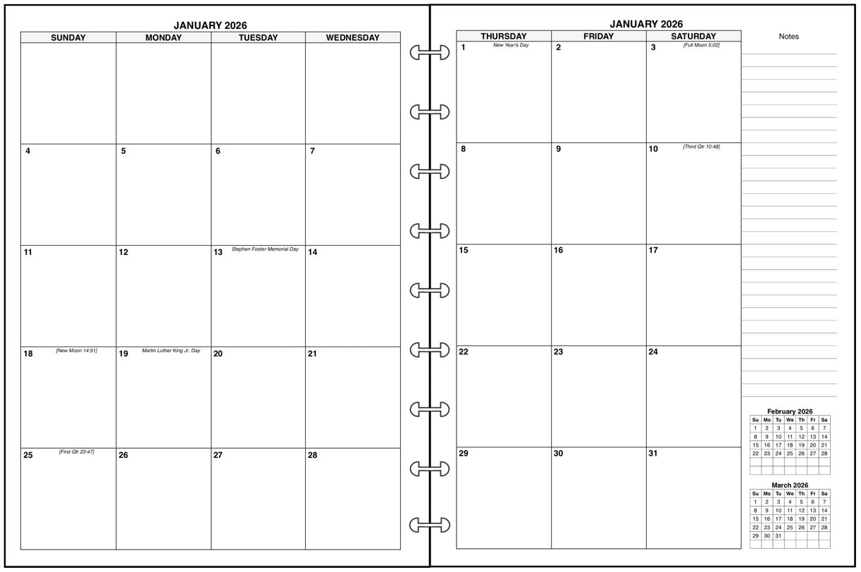 If selected, the monthly spreads are merged with the weekly pages so that the month appears immediately before the weekly pages where the first day of that month occurs. A durable plastic tab is attached to the weekly page just before the month. The monthly pages are available in 3 different formats called 6-column, 7-column, and 8-column. Please see the images for examples.