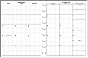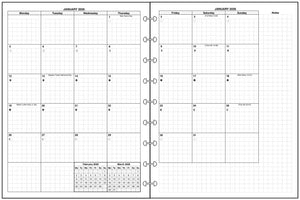 If selected, the monthly spreads are merged with the weekly pages so that the month appears immediately before the weekly pages where the first day of that month occurs. A durable plastic tab is attached to the weekly page just before the month. The monthly pages are available in 3 different formats called 6-column, 7-column, and 8-column. Please see the images for examples.
