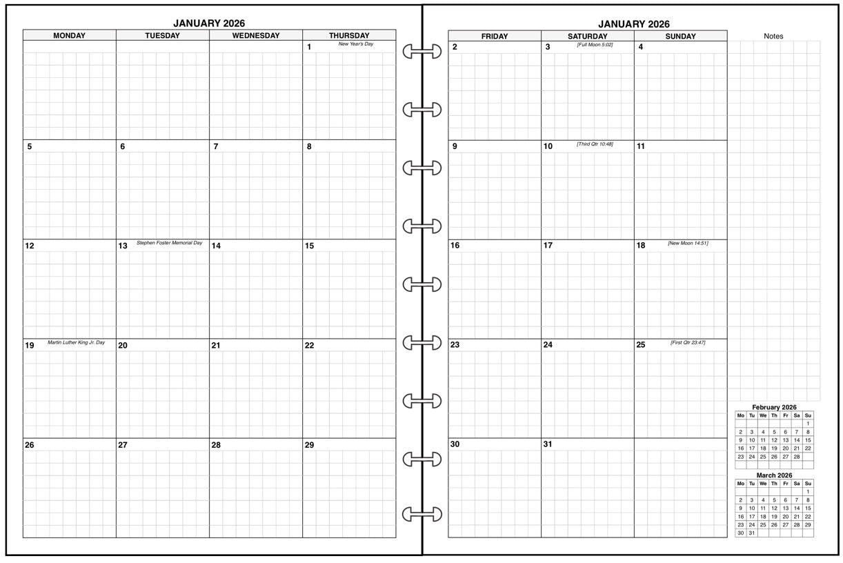 If selected, the monthly spreads are merged with the weekly pages so that the month appears immediately before the weekly pages where the first day of that month occurs. A durable plastic tab is attached to the weekly page just before the month. The monthly pages are available in 3 different formats called 6-column, 7-column, and 8-column. Please see the images for examples.