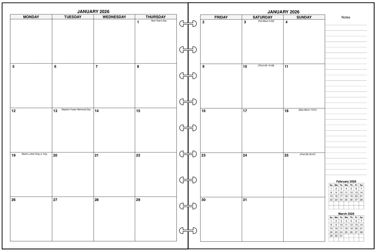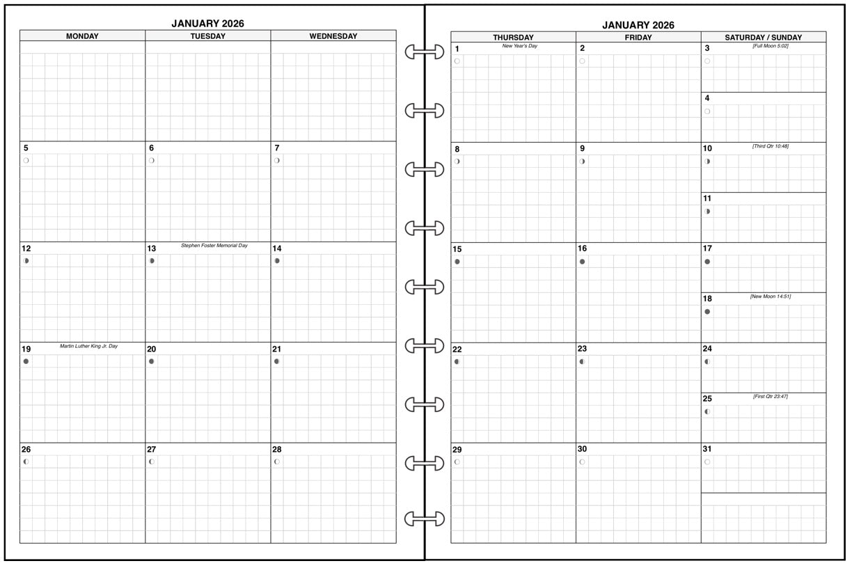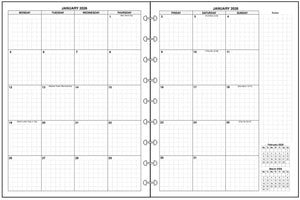 If selected, the monthly spreads are merged with the weekly pages so that the month appears immediately before the weekly pages where the first day of that month occurs. A durable plastic tab is attached to the weekly page just before the month. The monthly pages are available in 3 different formats called 6-column, 7-column, and 8-column. Please see the images for examples.