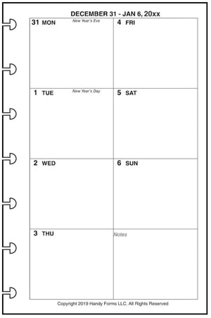 This is a weekly and monthly planner insert for Happy Planner Mini size disc bound notebooks. Page is Happy Planner Mini size, 4.6in x 7in. Choose the week start day as Sunday or Monday. Each week is on one page. The daily blocks are arranged vertically with the first 4 days of the week on the left, the next 3 on the right, plus a block for notes.