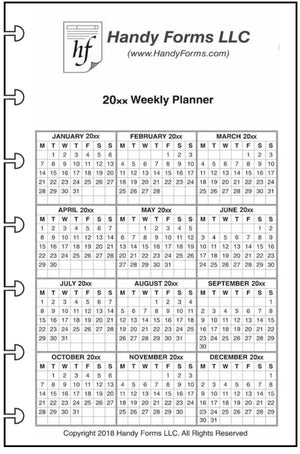 If selected, the monthly spreads are merged with the weekly pages so that the month appears immediately before the weekly pages where the first day of that month occurs. A durable plastic tab is attached to the weekly page just before the month. The monthly pages are available in 3 different formats called 6-column, 7-column, and 8-column. Please see the images for examples.