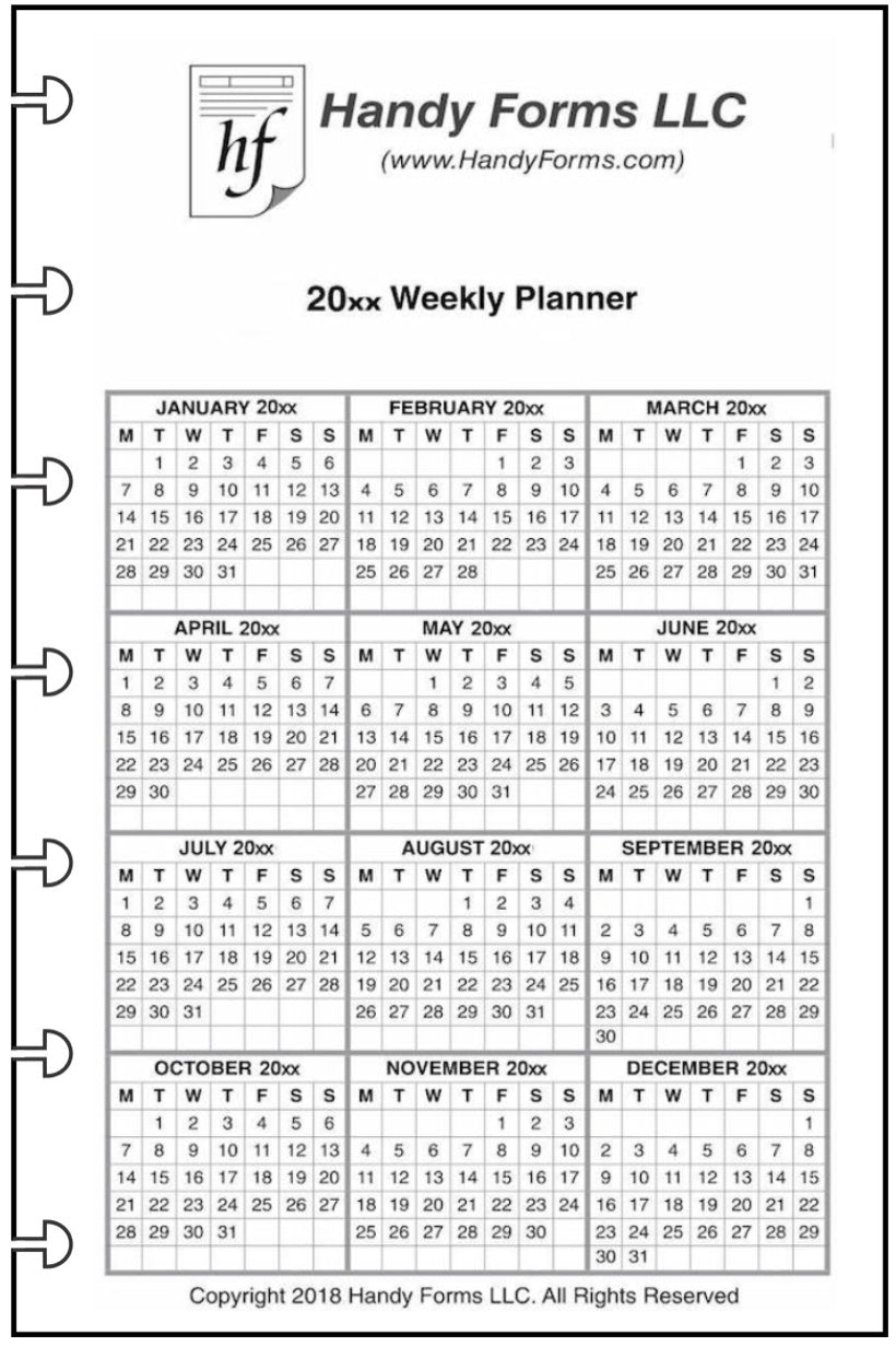 This is a weekly and monthly planner insert for Happy Planner Mini size disc bound notebooks. Page is Happy Planner Mini size, 4.6in x 7in. Choose the week start day as Sunday or Monday. Each week is on one page, with separate blocks for each day. There are 3 mini-reference calendars across the bottom of each page for the previous, current, and following month.