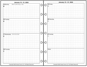 If selected, the monthly spreads are merged with the weekly pages so that the month appears immediately before the weekly pages where the first day of that month occurs. A durable plastic tab is attached to the weekly page just before the month. The monthly pages are available in 3 different formats called 6-column, 7-column, and 8-column. Please see the images for examples.