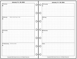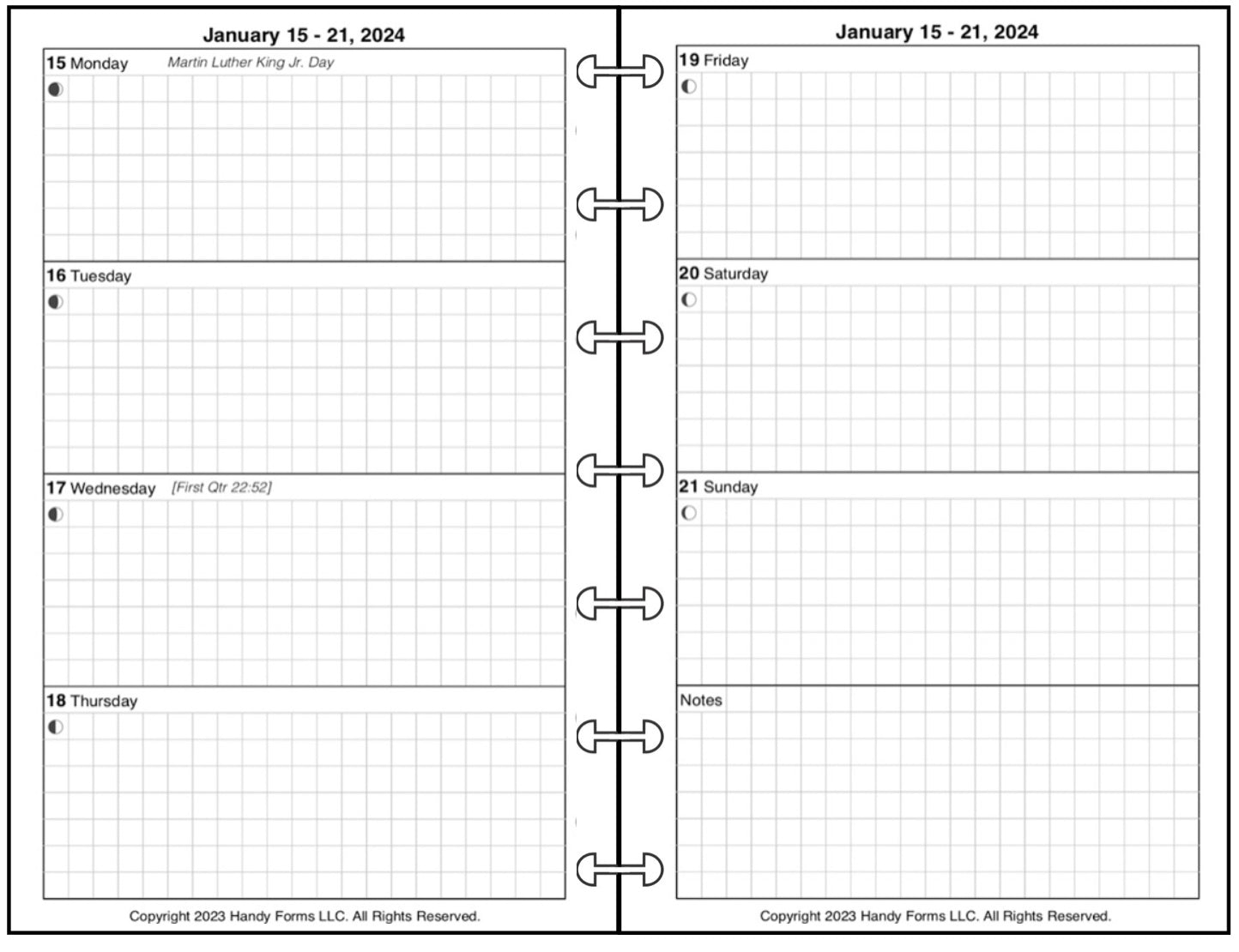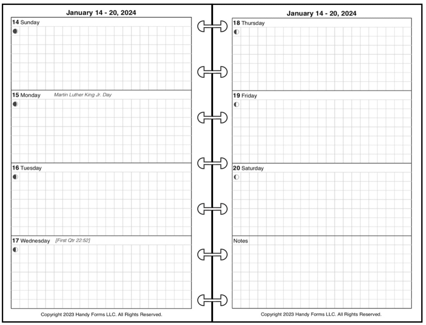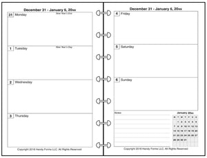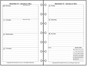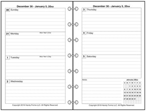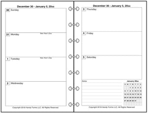 This is a weekly & monthly planner insert for Happy Planner Mini size disc bound notebooks. Page is Happy Planner Mini size, 4.6in x 7in. Each week is on 2 pages. Choose the week start day as Sunday or Monday. The first 4 days of the week are on the left, and the last 3 are on the right, plus space for notes and a mini reference calendar of the current month.
