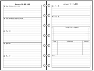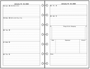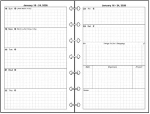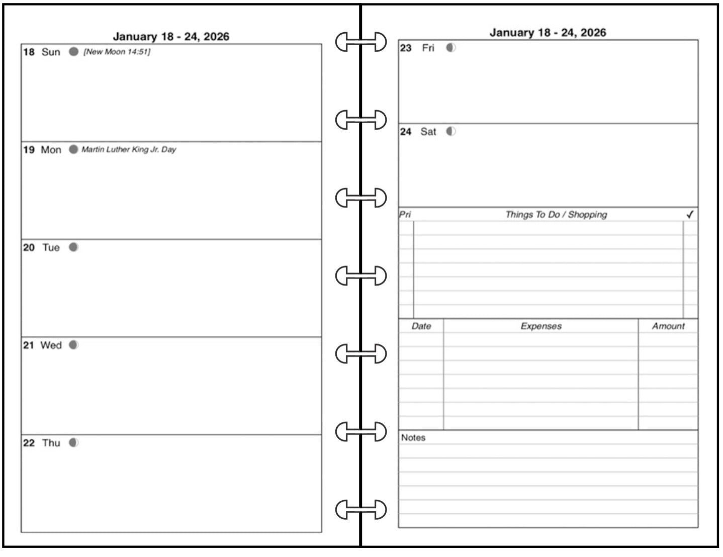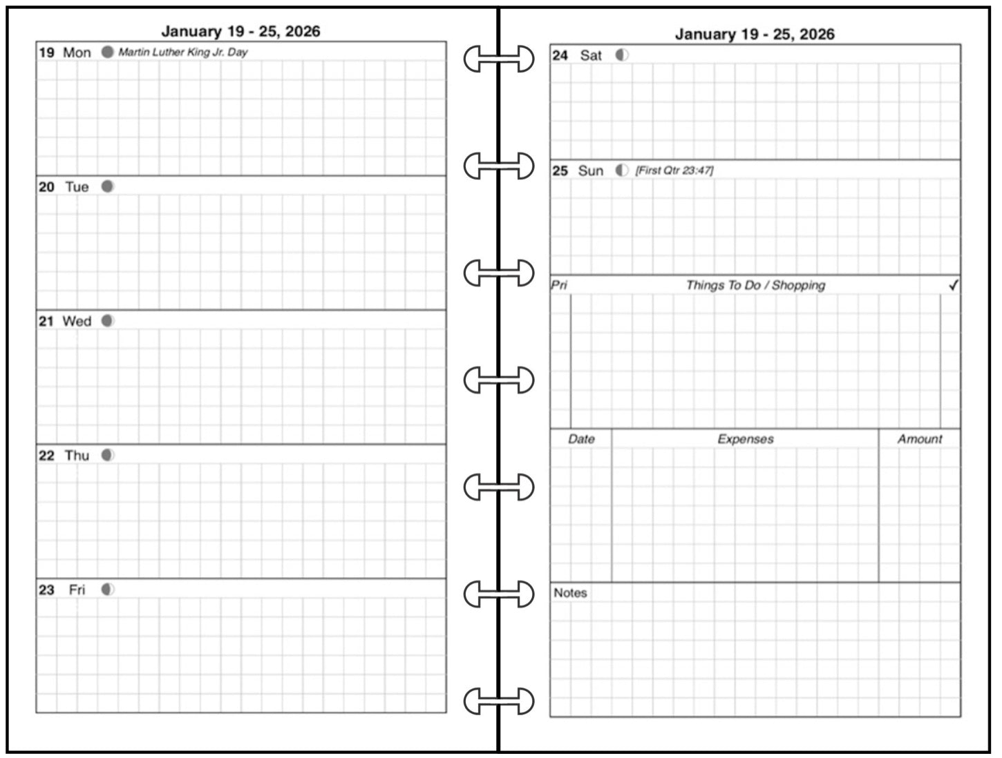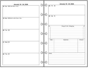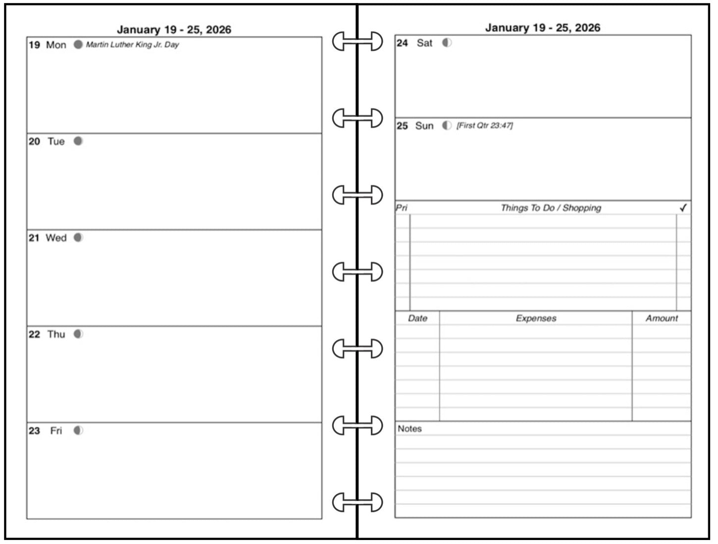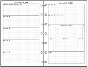 This is a weekly & monthly planner insert for Happy Planner Mini size disc bound notebooks. Page is Happy Planner Mini size, 4.6in x 7in. Choose the week start day as Sunday or Monday. Each week is a 2-page spread. The first 5 days of the week on the left, the last 2 on the right. On the right there are sections for a weekly To-Do list, an expense record, and notes.