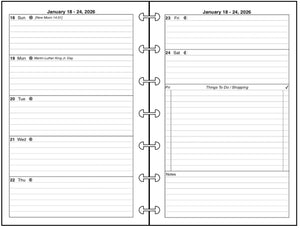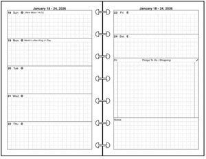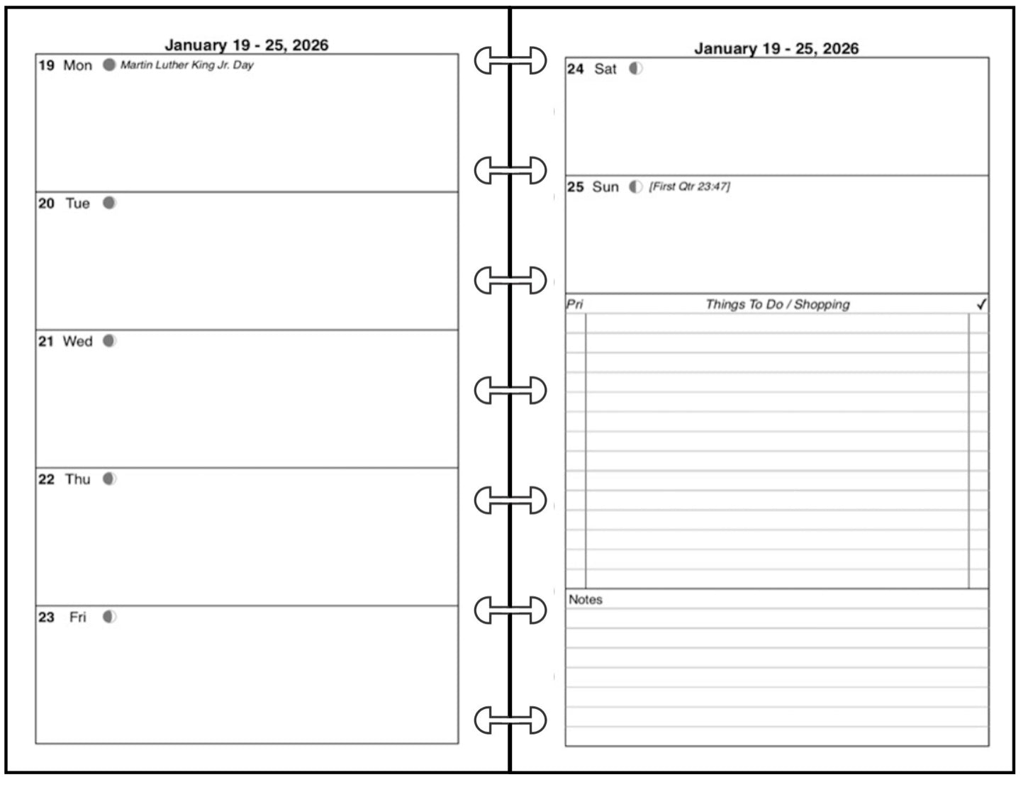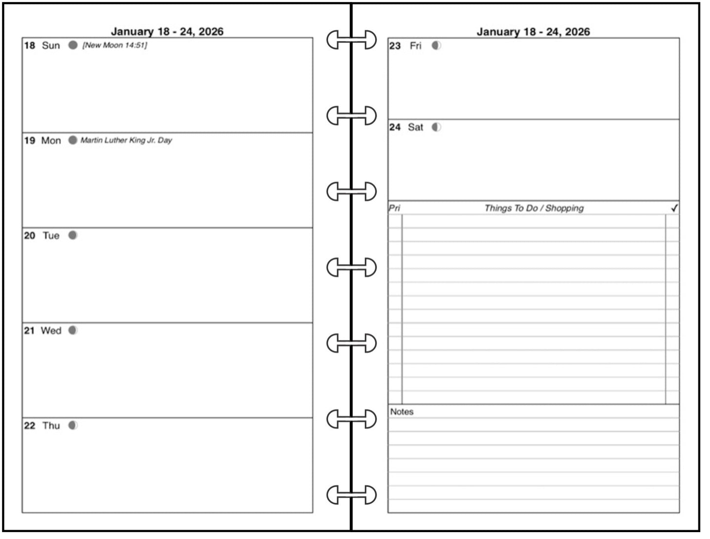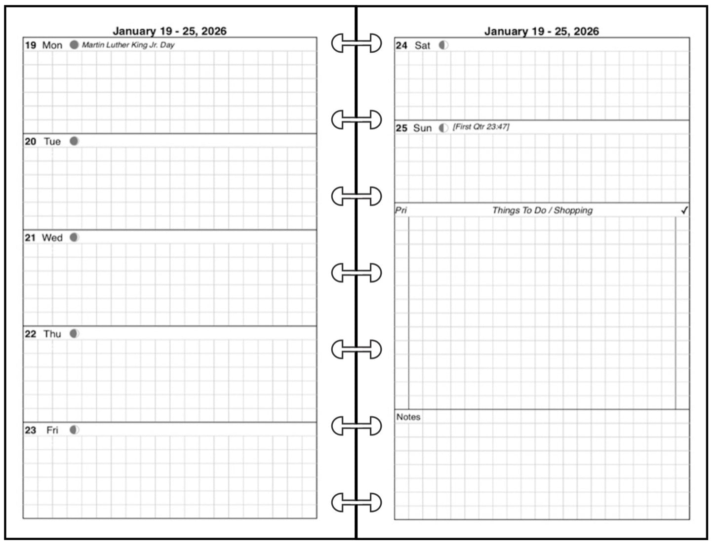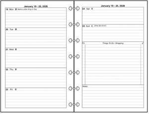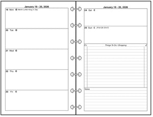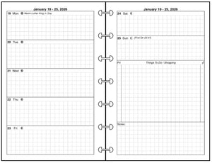 This is a weekly & monthly planner insert for Happy Planner Mini size disc bound notebooks. Page is Happy Planner Mini size, 4.6in x 7in. Choose the week start day as Sunday or Monday. Each week is a 2-page spread. The first 5 days of the week on the left, the last 2 on the right. On the right there are sections for a weekly To-Do list and notes.