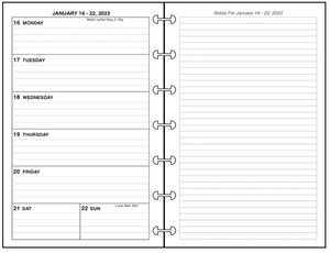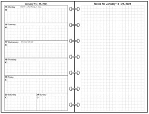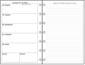 This is a weekly & monthly planner insert for Happy Planner Mini size disc bound notebooks. Page is Happy Planner Mini size, 4.6in x 7in. The week starts with Monday. Each week is a 2-page spread. The days of the week are on the left. Monday through Friday are full width blocks, with Saturday and Sunday half-size at the bottom. On the right is a page for notes.