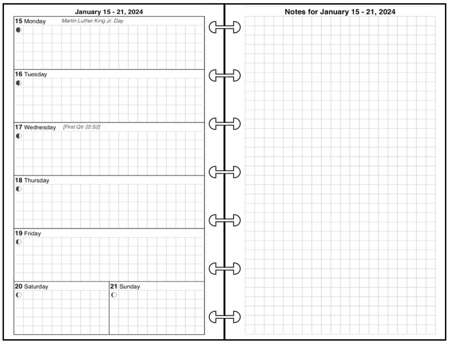 If selected, the monthly spreads are merged with the weekly pages so that the month appears immediately before the weekly pages where the first day of that month occurs. A durable plastic tab is attached to the weekly page just before the month. The monthly pages are available in 3 different formats called 6-column, 7-column, and 8-column. Please see the images for examples.
