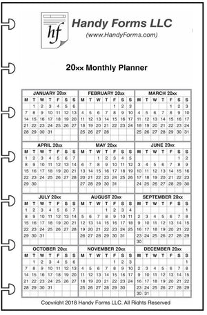 This is a monthly planner insert for Happy Planner Mini size disc bound notebooks. Page is Happy Planner Mini size, 4.6in x 7in. The week starts with Sunday or Monday. Each month is a 2-page spread, with a lined note page before and after. The days are arranged according to the style (see below). There are no lines printed in the daily blocks. For 6-column and 8-column styles, if the 30th and/or the 31st would fall below the bottom row, these dates are moved to the first 2 daily blocks in the first row.