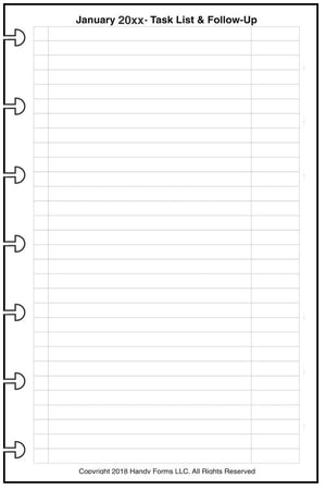 This is a monthly planner insert for Happy Planner Mini size disc bound notebooks. Page is Happy Planner Mini size, 4.6in x 7in. The week starts with Sunday or Monday. Each month is a 4 pages. The first page is labeled "Priorities and Plans" for the month, and includes 3 mini reference calanders for the current and following 2 months. Following this page is the 2-page calendar spread for the month with days arranged according to the monthly style (see below). The 4th page is labeled "Task List and Follow-Up" for the month. For 6-column and 8-column styles, if the 30th and/or the 31st would fall below the bottom row, these dates are moved to the first 2 daily blocks in the first row. Lines are printed in the daily blocks.