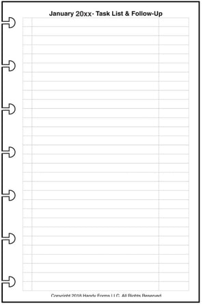 This is a monthly planner insert for Happy Planner Mini size disc bound notebooks. Page is Happy Planner Mini size, 4.6in x 7in. The week starts with Sunday or Monday. Each month is a 4 pages. The first page is labeled "Priorities and Plans" for the month, and includes 3 mini reference calanders for the current and following 2 months. Following this page is the 2-page calendar spread for the month with days arranged according to the monthly style (see below). The 4th page is labeled "Task List and Follow-Up" for the month. For 6-column and 8-column styles, if the 30th and/or the 31st would fall below the bottom row, these dates are moved to the first 2 daily blocks in the first row. There are no lines printed in the daily blocks.