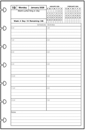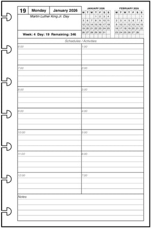 This is a daily and monthly planner insert for Happy Planner Mini size disc bound notebooks. Page is Happy Planner Mini size, 4.6in x 7in. Choose the week starting day as Sunday or Monday. Each day is on one page. The hourly appointment blocks are arranged vertically in 2 columns with times from 6:00 am through 7:00 pm. The appointment time range can be changed through customization.