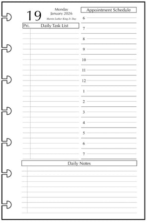 This is a daily and monthly planner insert for Happy Planner Mini size disc bound notebooks. Page is Happy Planner Mini size, 4.6in x 7in. Choose the week starting day as Sunday or Monday. Each day is on one page. There is a checkmarked section for Daily Tasks, appointment times from 6:00 am to 7:00 pm, and a block for notes.