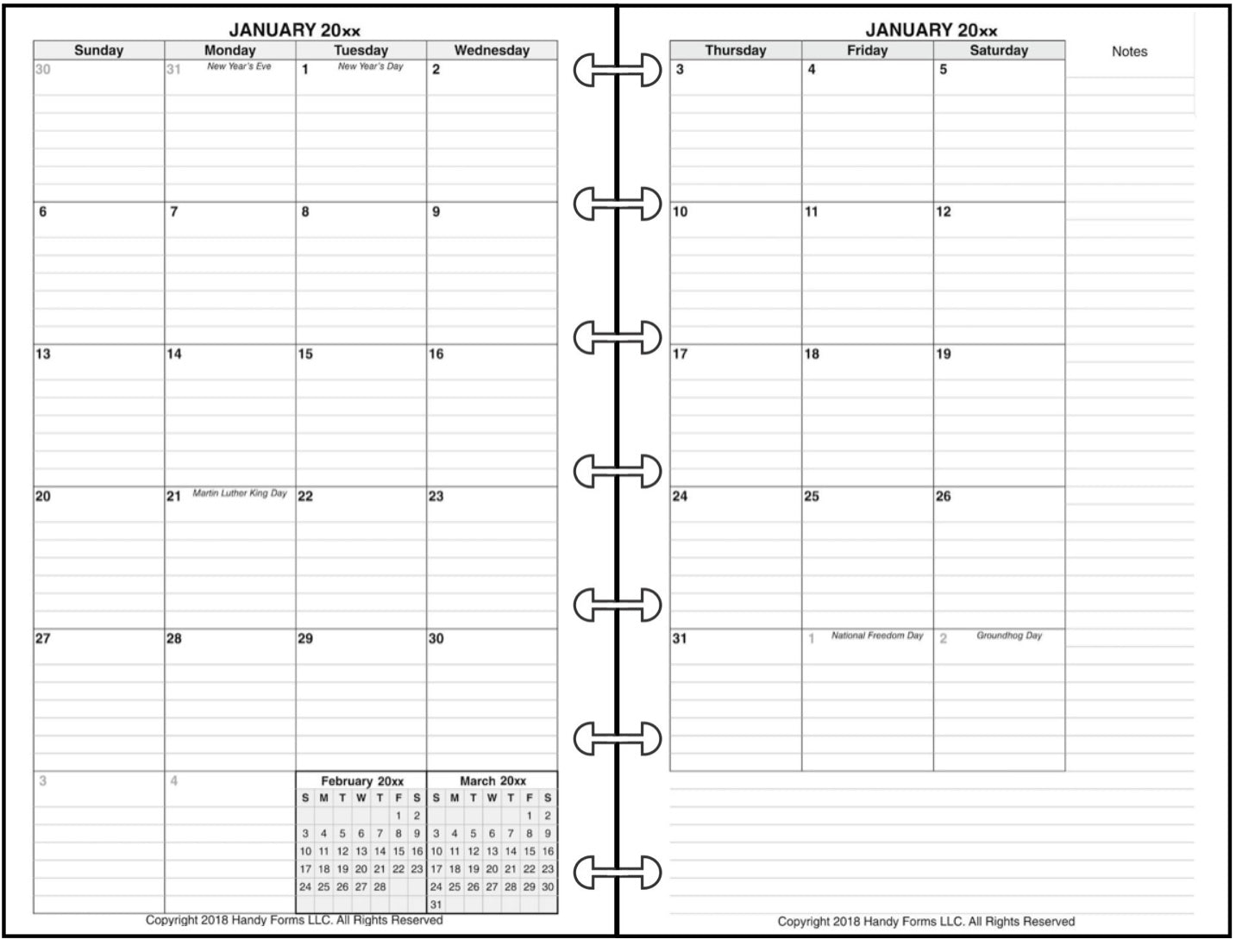 This is a daily and monthly planner insert for HP Mini size notebooks. Choose the week starting day as Sunday or Monday. Each day is on two pages, and months are 2-page spreads. Each daily page has appointment slots from 7:00 am to 8:00 pm. In addition there is a column for activities/schedule, and a checklist for things to do. Included are mini calendars for the current and next months.