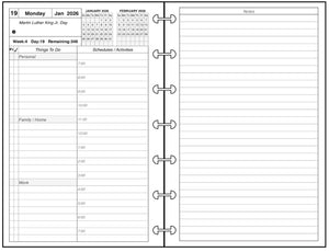 This is a daily and monthly planner insert for Happy Planner Mini size disc bound notebooks. Page is Happy Planner Mini size, 4.6in x 7in. Choose the week starting day as Sunday or Monday. Each day is on two pages, and months are 2-page spreads. Each daily page has appointment slots from 7:00 am to 8:00 pm. In addition there is a column for daily schedule/activities and a checklist for things to do. The daily activity section is divided into 3 subsections labeled Personal, Family / Home, and Work. The subsection names can be changed through customization. Included are mini calendars for the current and next months.