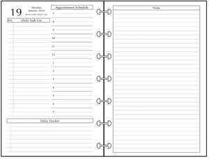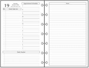 This is a daily and monthly planner insert for Happy Planner Mini size disc bound notebooks. Page is Happy Planner Mini size, 4.6in x 7in. Choose the week starting day as Sunday or Monday. Each day is on two pages. There is a checkmarked section for Daily Tasks, appointment times from 7:00 am to 7:00 pm, a Daily Monitor for tracking important things like expenses and messages, and a block for notes.