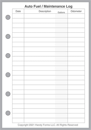 If you like to keep track of your car's fuel, maintenance, and mileage, this planner insert is just the thing. It is sized and punched for the Pocket Plus size notebooks. binder. Record the date, description, and odometer reading for any maintenance, new tires, changes, etc. For fuel, write down the date, number of gallons, and the odo reading. In the description area you can keep track of the price per gallon. The back of each page is lined for keeping notes.