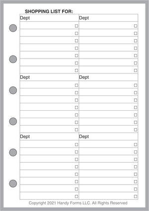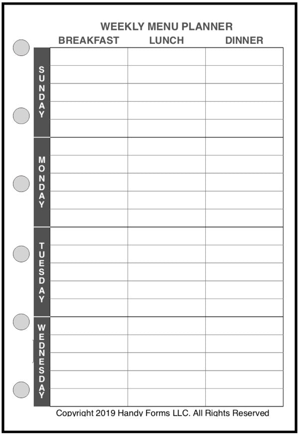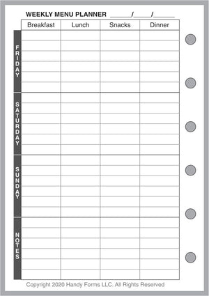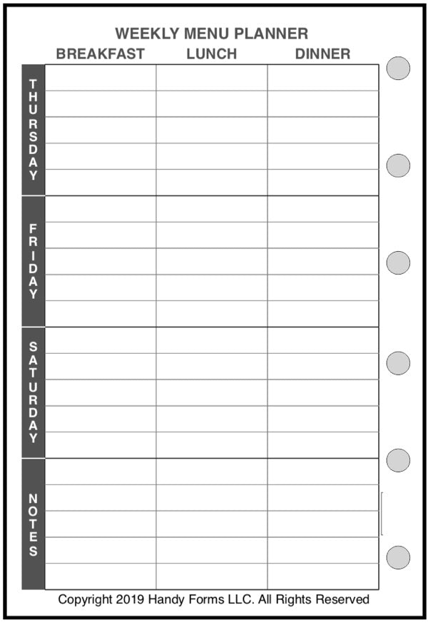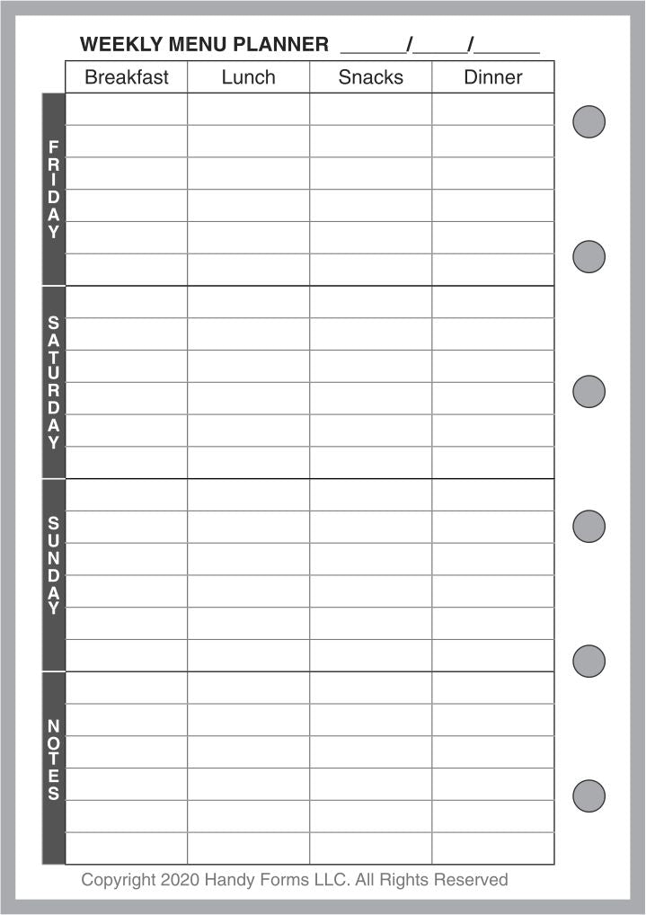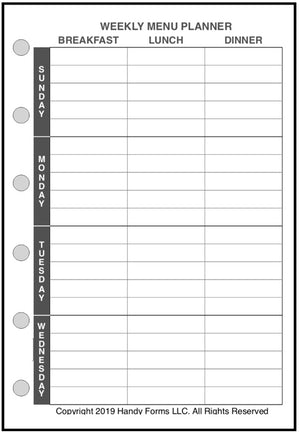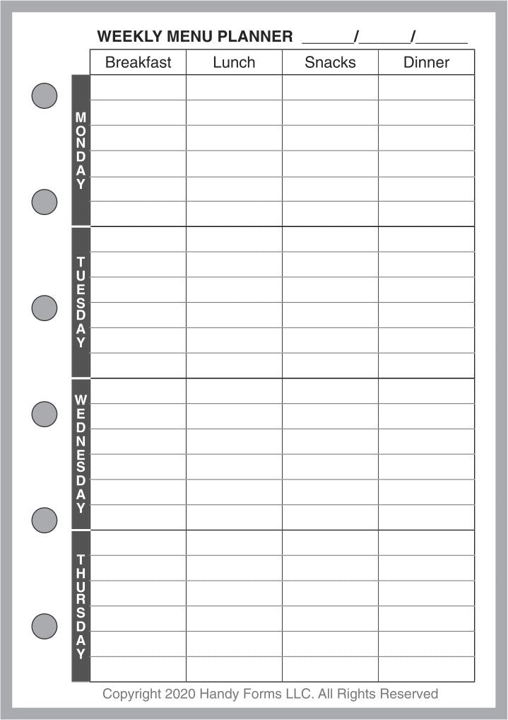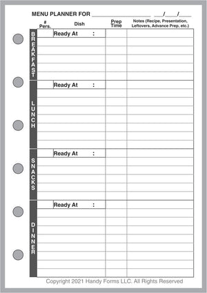 Planning meals, especially for a busy family with entertainment, school functions, work commitments, and community activities can be very challenging. What are we having for dinner next Thursday? What do I have to shop for? How many people will be at the table? This handy form for your Pocket Plus size notebooks. planner can help. It combines 3 different forms: (1) a weekly meal planner for each day, including breakfast, lunch, snacks (or hors d'oeurves), and dinner; (2) a daily meal planner for breakfast, lunch, snacks, and dinner, including the number of people, the time it has to be ready, each dish planned, the preparation time, plus special notes about the recipe, presentation, left overs, advanced prep, etc.; and (3) a shopping list form separating items by store, date, and department, providing a check-off for items purchased.