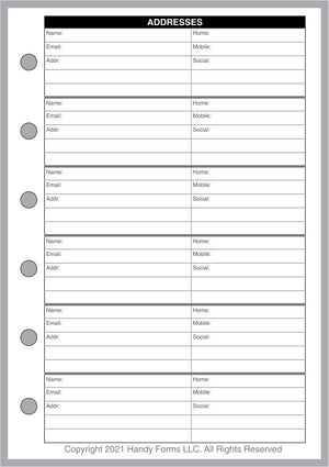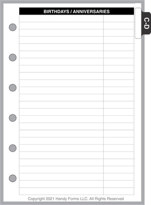 • Includes 50 sheets for name & address entries, plus tabbed alphabetic index pages A-B, C-D, E-F, etc. which include birthdays and anniversaries