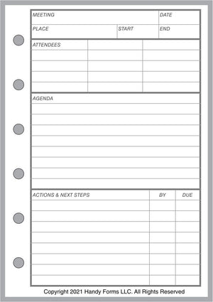This is a helpful Meeting Planner and Organizer for Pocket Plus size notebooks. notebooks. This handy form is ideal to help organize and document meetings. Included are spaces for date, time, and location of the meeting, the attendees, the meeting agenda, actions and follow-up including who is responsible. The reverse side of the form is for discussion notes.