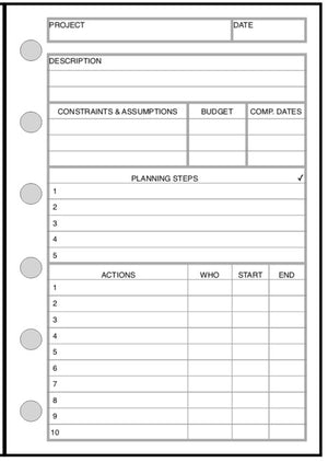 This is a helpful Project Planner and Organizer for Pocket Plus size notebooks. This handy form is ideal to help organize and document projects. Included are spaces for the project planning stage, action steps, and project milestones. Although thiss is not intended to replace formal project management, it can serve as an important planning and coordination tool.