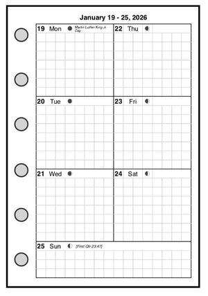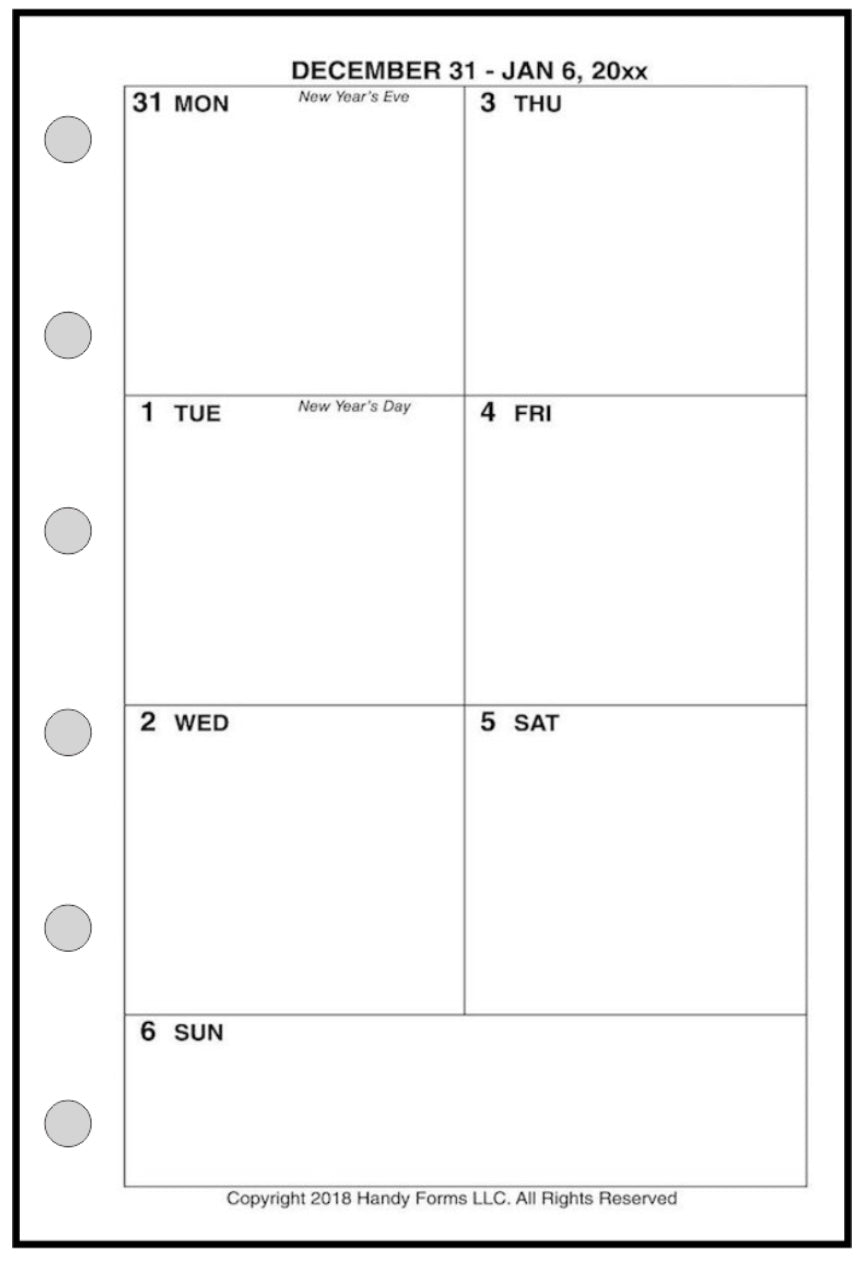 This is a weekly & monthly planner insert for Pocket-Plus size notebooks. Page is Pocket-Plus size, 3½" x 5". Choose the week start day as Sunday or Monday. The first 6 days of the week are arranged in square blocks, with the 7th day a rectangle across the bottom.
