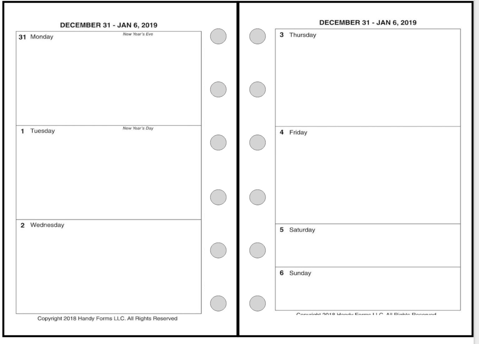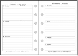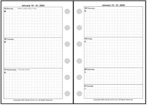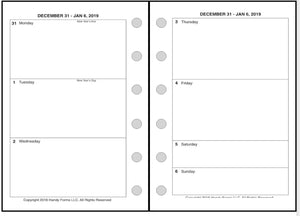 This is a weekly & monthly planner insert for Pocket Plus size notebooks. Page is Pocket Plus size, 3½" x 5". The week starts on Monday. Each week is on one page. The 2 page weekly spread provides large blocks for Monday through Friday, and half size blocks for Saturday and Sunday.