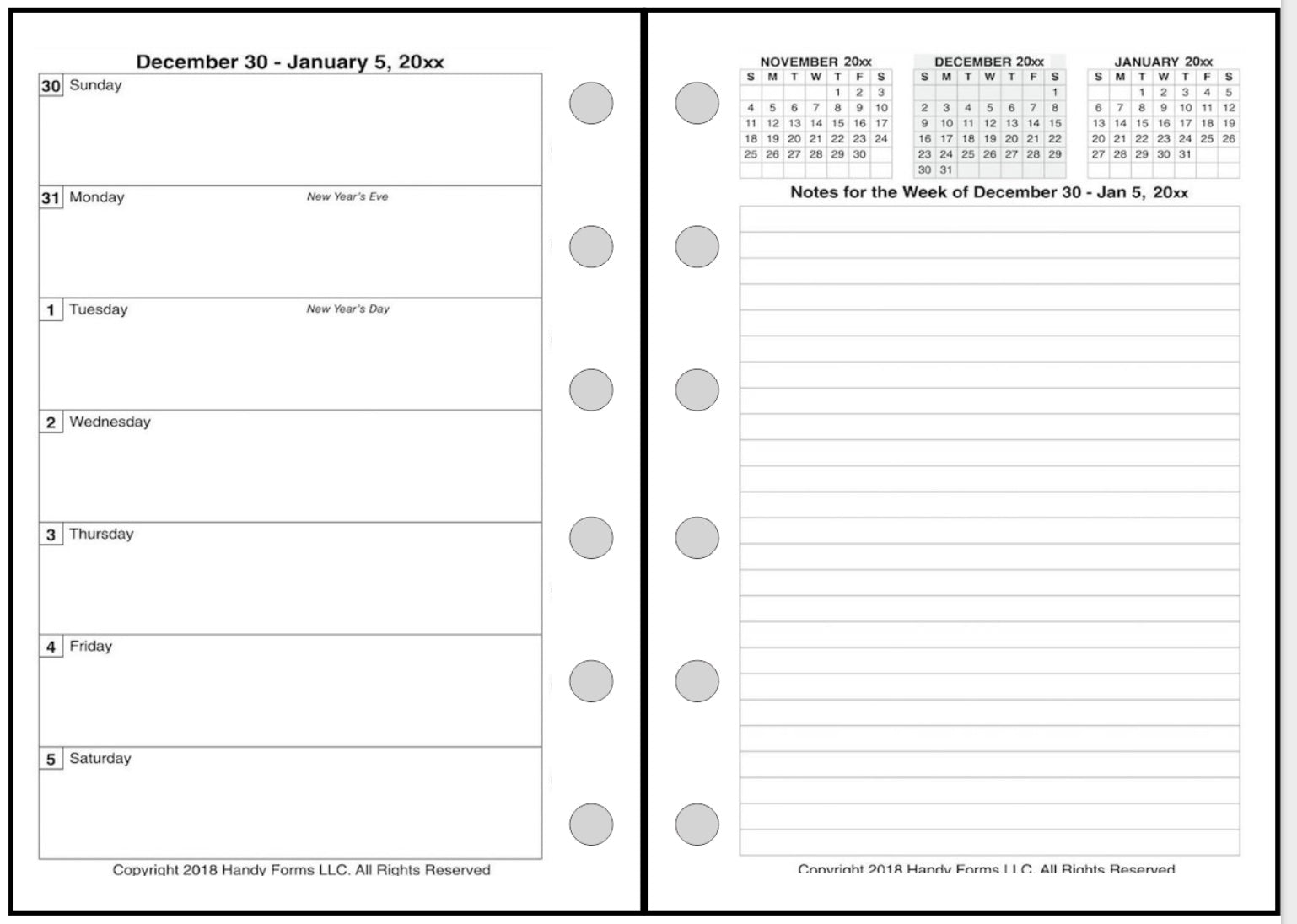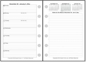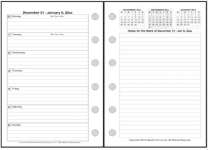 This is a weekly & monthly planner insert for Pocket Plus size notebooks. Page is Pocket Plus size, 3½" x 5". Choose the week start day as Sunday or Monday. Each week is a 2-page spread. The days of the week are on the left. On the right is a note page which includes mini-reference monthly calendars showing the previous, current, and following months.