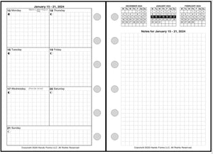 This is a weekly & monthly planner insert for Pocket Plus size notebooks. Page is Pocket Plus size, 3½" x 5". Choose the week start day as Sunday or Monday. Each week is a 2-page spread. The days of the week are on the left. The first 6 days of the week are arranged in 2 columns, 3 days on the left and 3 on the right. The 7th day spans across the bottom. On the right is a note page which includes mini-reference monthly calendars showing the previous, current, and following months.