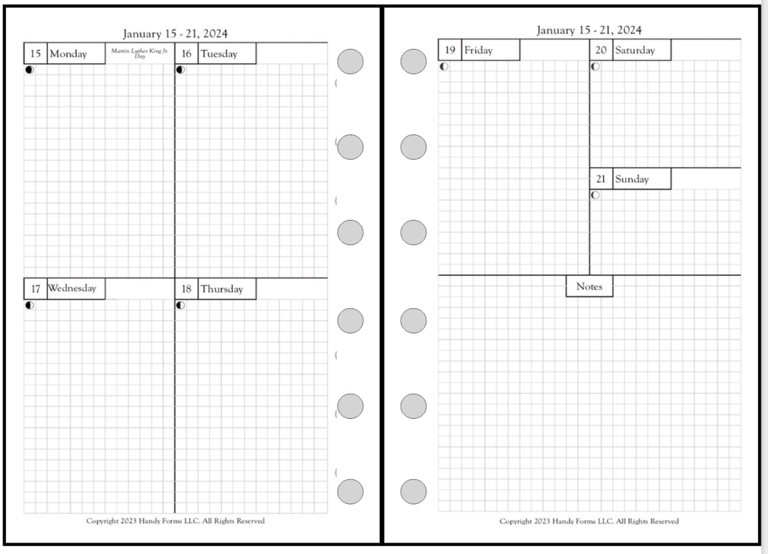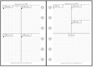 This is a weekly & monthly planner insert for Pocket Plus size notebooks. Page is Pocket Plus size, 3½" x 5". The week starts with Monday. Each week is a 2-page spread. Monday-Thursday are are on the left, with Friday-Sunday on the right. The writing space for each day is a faint line grid. Below the Friday, Saturday and Sunday blocks is a line grid for notes.