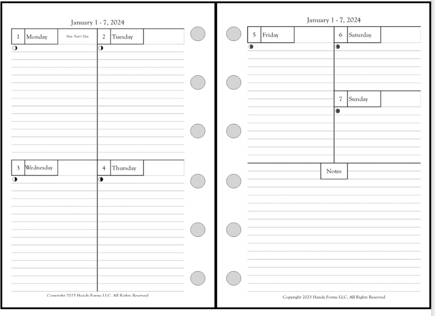 If selected, the monthly spreads are merged with the weekly pages so that the month appears immediately before the weekly pages where the first day of that month occurs. A durable plastic tab is attached to the weekly page just before the month. The monthly pages are available in 3 different formats called 6-column, 7-column, and 8-column. Please see the images for examples.