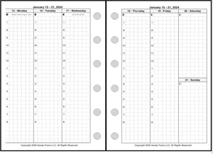 This is a weekly & monthly planner insert for Pocket Plus size notebooks. Page is Pocket Plus size, 3½" x 5". The week starts on Monday. Each day of the week is a vertical column. The first 3 days of the week are on the left, and the last 4 are on the right, with Saturday and Sunday sharing the right-hand column. Time slots are printed for 7:00 AM through 7:00 PM on each weekday. There is a mini reference calendar for the current month at the bottom of the right-most column.