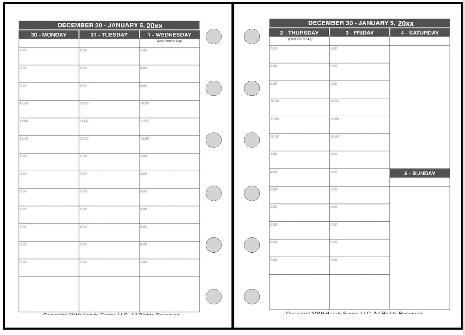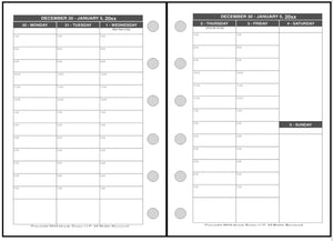 If selected, the monthly spreads are merged with the weekly pages so that the month appears immediately before the weekly pages where the first day of that month occurs. A durable plastic tab is attached to the weekly page just before the month. The monthly pages are available in 3 different formats called 6-column, 7-column, and 8-column. Please see the images for examples.